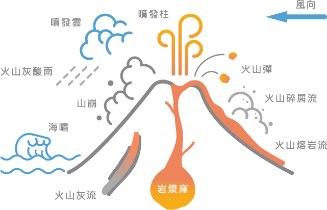 火山噴發可能的災害,包含火山灰、火山熔岩、火山碎屑流、火山彈、火山泥流等。除了可能危害環境,甚至會導致生態破壞。